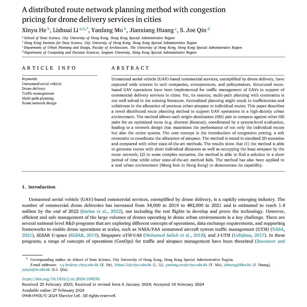 03/2024: Congratulations to Dr. Xinyu He and the co-authors for the acceptance of our recent paper “A distributed route network planning method with congestion pricing for drone delivery services in cities” on Transportation Research Part C: Emerging Technologies, Volume 160, March 2024, 104536. [PDF]