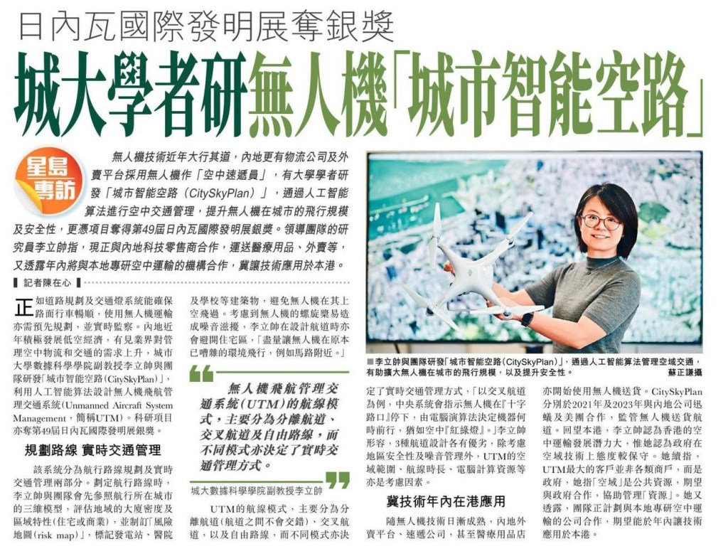 05/2024: The Sing Tao Daily (Chinese: 星島日報) features our Unmanned Aircraft System Traffic Management (UTM) research and the Silver Award received at 49th International Exhibition of Inventions Geneva (IEIG). The coverage is available here.